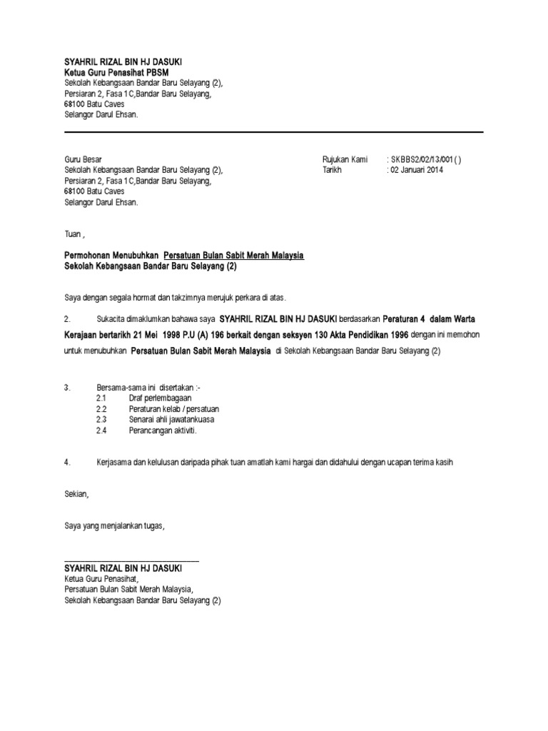 Contoh Surat Permohonan Penubuhan Kelab Dan Persatuan Bahasa Melayu Pdf